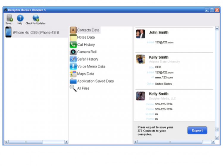 Decipher Backup Browser Программа, с помощью которой можно просматривать содержимое бэкапов с iPhone. Позволяет открывать и сохранять фотографии, голосовые/текстовые заметки и пр. Контакты можно экспортировать в VCF файл.