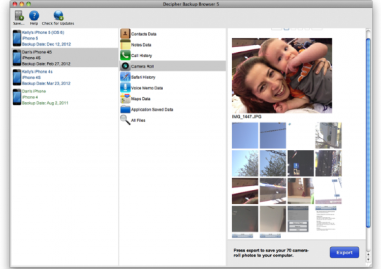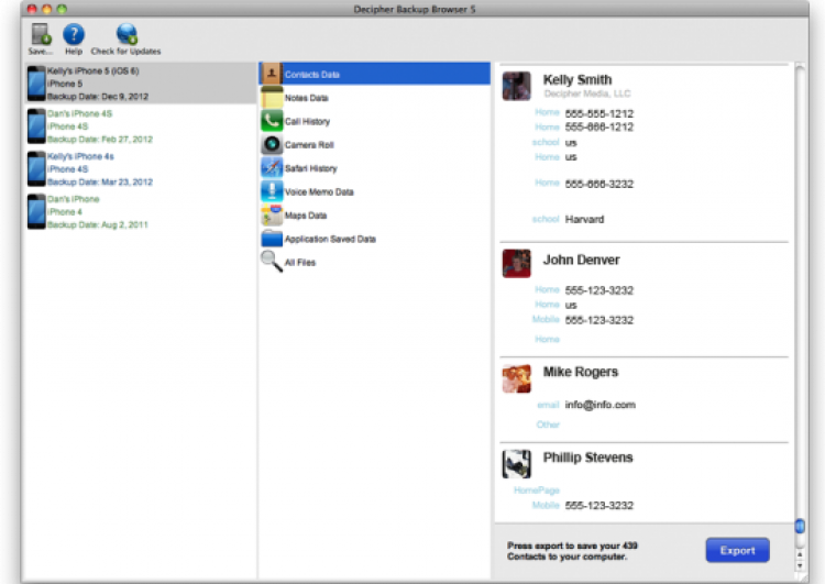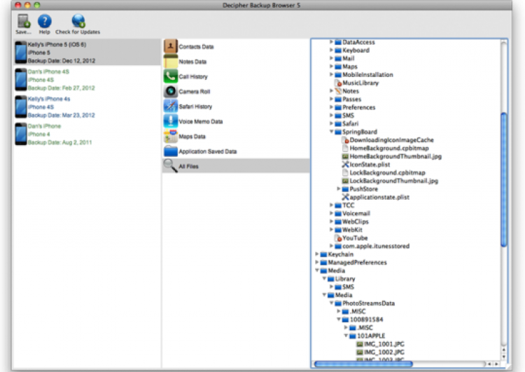 Decipher Backup Browser Программа, с помощью которой можно просматривать содержимое бэкапов с iPhone. Позволяет открывать и сохранять фотографии, голосовые/текстовые заметки и пр. Контакты можно экспортировать в VCF файл.