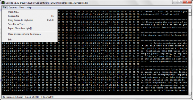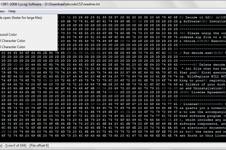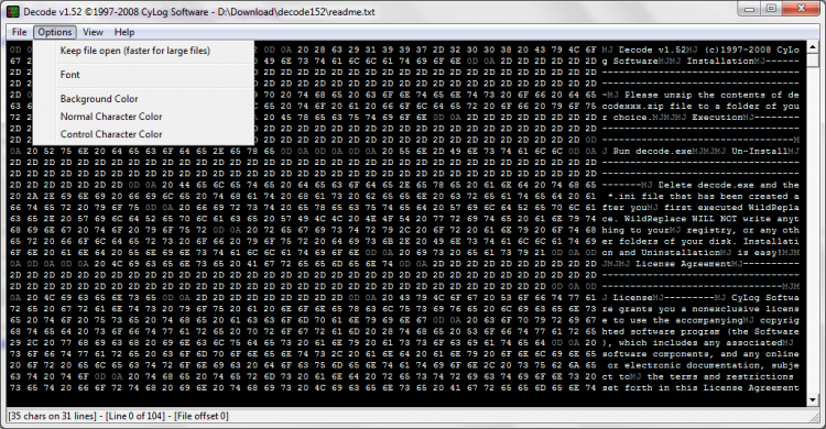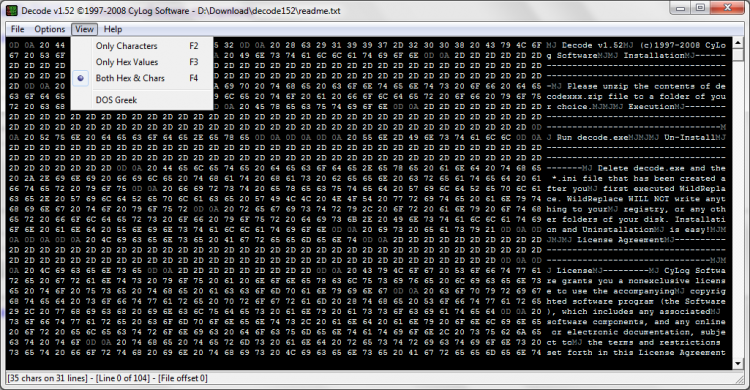 Decode - это простая программа, которая позволяет увидеть шестнадцатеричный код любого текстового файла. Ничего другого она не умеет, с ее помощью можно просто открыть и посмотреть HEX-код текстового документа. Из доступных опций можно выделить смену цвета фона, обычных и контрольных символов, а также возможность выбрать, что отображать: символы, HEX-код, или оба сразу. Кроме этого, программа позволяет скопировать все в буфер, сохранить код в новый txt или java файл.