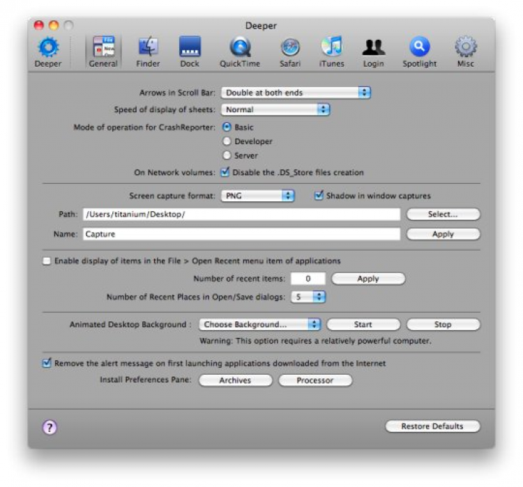 Deeper Утилита, которая предоставляет доступ к скрытым или заблокированным функциям Finder`а, Дока, QuickTime, Safari, iTunes, окна логина, Spotlight и многих других программ от Apple.