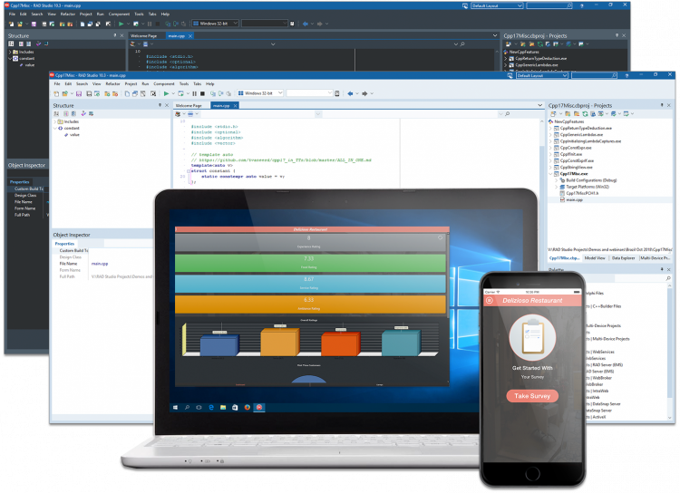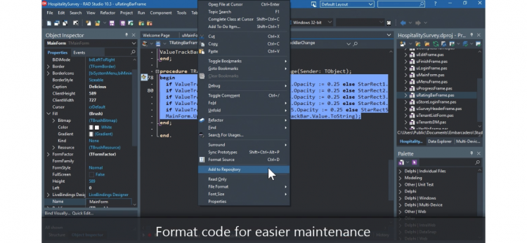 Этот инструмент разработки прекрасно подойдёт для тех, кому необходимо создать интуитивные приложения для компьютера или смартфона, способные подключаться к корпоративным и облачным сервисам, а также синхронизироваться с носимыми устройствами. При помощи Delphi IDE, программисты получат возможность разрабатывать десктопные и мобильные программы из единой кодовой базы. Выбрать тип разрабатываемого продукта можно ещё перед началом работы над проектом, после чего в любой момент можно модифицировать готовый код для лучшей поддержки целевых платформ.