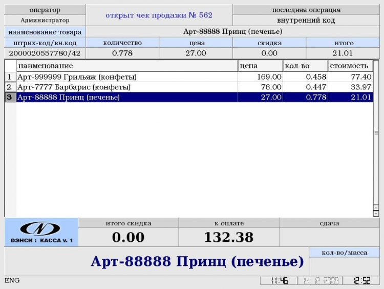 ДЭНСИ:КАССА упрощает работу работу кассира, обеспечивает надёжный обмен информацией с товароучётной программой (1С 7.7 и 8, Айтида).