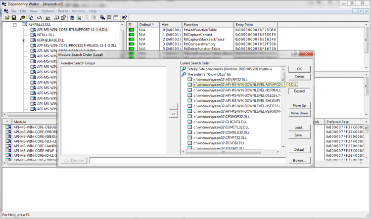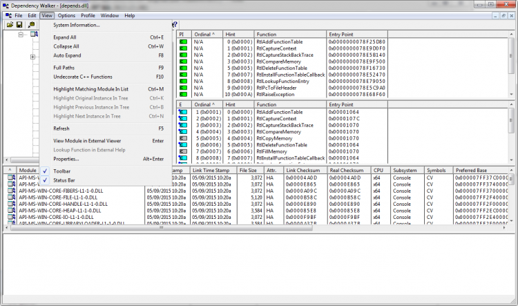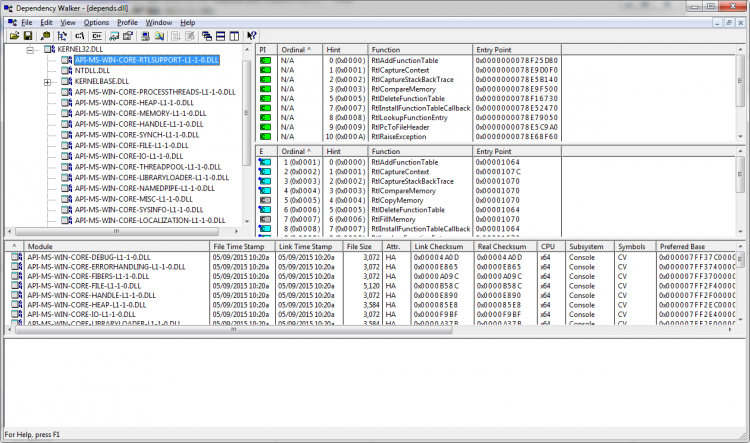 Dependency Walker - это бесплатная программа, которая сканирует модули (ocx, dll, exe, sys и пр.) 32- и 64-разрядных версий ОС Windows, и строит древовидный список всех зависимых модулей. Для каждого найденного модуля программа выводит список всех экспортированных функций, и показывает, какие из этих функций используются другими модулями.