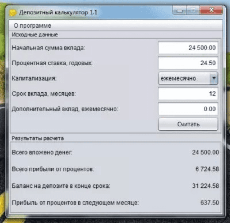 Депозитный калькулятор — это небольшая компьютерная программа, которая поможет быстро рассчитать прибыльность банковского вклада. Это ПО уже готово к использованию и не требует инсталляции.