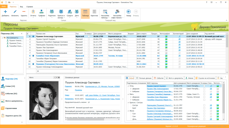 Программа «Дерево поколений» предназначена для построения генеалогического (родословного) дерева. С её помощью вы сможете вести базу данных по персонам, семьям и событиям в их жизни, прилагая при этом необходимые фото и документы. Программа проста в использовании и обладает богатыми возможностями при настройке интерфейса. Отображение информации по каждому объекту возможно в табличном виде или в виде карточки.