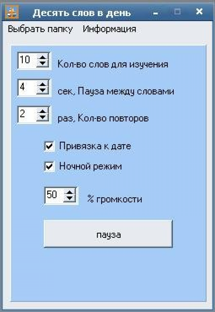 - Количество слов для изучения - количество слов (диалогов), которые программа будет проигрывать при запуске;