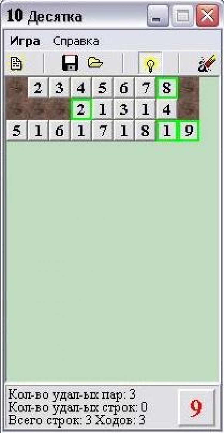 Десятка - это логическая игра головоломка. Цель игры - уничтожить все цифры на поле. Цифры уничтожаются по определенному правилу...На поле 3х9 расположены цифры 1,2,3,4,5,6,7-19 кроме 10. Цель игры очистить поле от цифр, путем их удаления. Цифры удаляются по простому правилу: чтобы в сумме давали 10 или равные друг другу, а также клетки цифр должны соприкасаться краями или между ними не должны быть другие клетки. Удалять можно по вертикали, по горизонтали и с переходом на следующую строчку. Если подходящие комбинации заканчиваются, то необходимо приписать оставшиеся цифры в конец цепочки... и так до победного конца...