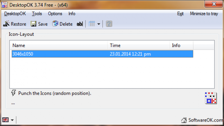 DesktopOK - это программа, которая запоминает расположение всех иконок на рабочем столе ОС Windows, и позволяет восстанавливать их. Программа может сохранять неограниченное количество схем расположения иконок, переименовывать их, удалять и восстанавливать.