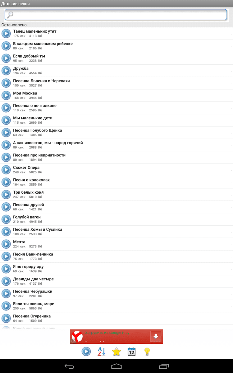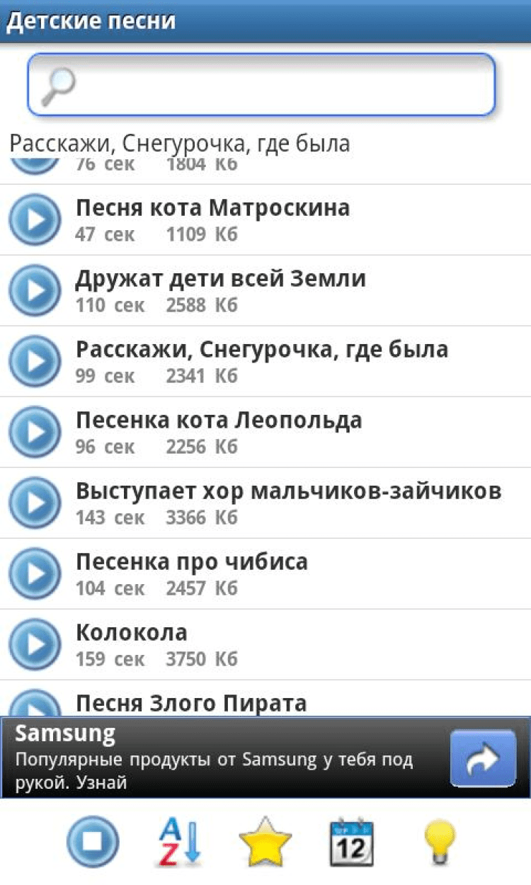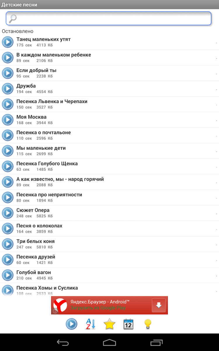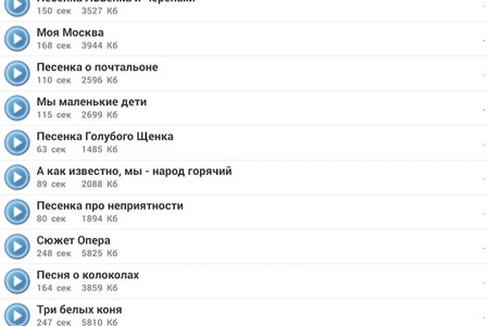 Детские песни В этом приложении собраны лучшие песни под которые росли дети Советского Союза - Вы или, возможно, Ваши мамы и папы, бабушки и дедушки. Все эти песни отличаются хорошей и доброй музыкой, смыслом и позитивным настроем. Теперь Ваши дети смогут слушать песни Вашего детства. В сборник вошло около 200 композиций в хорошем качестве.