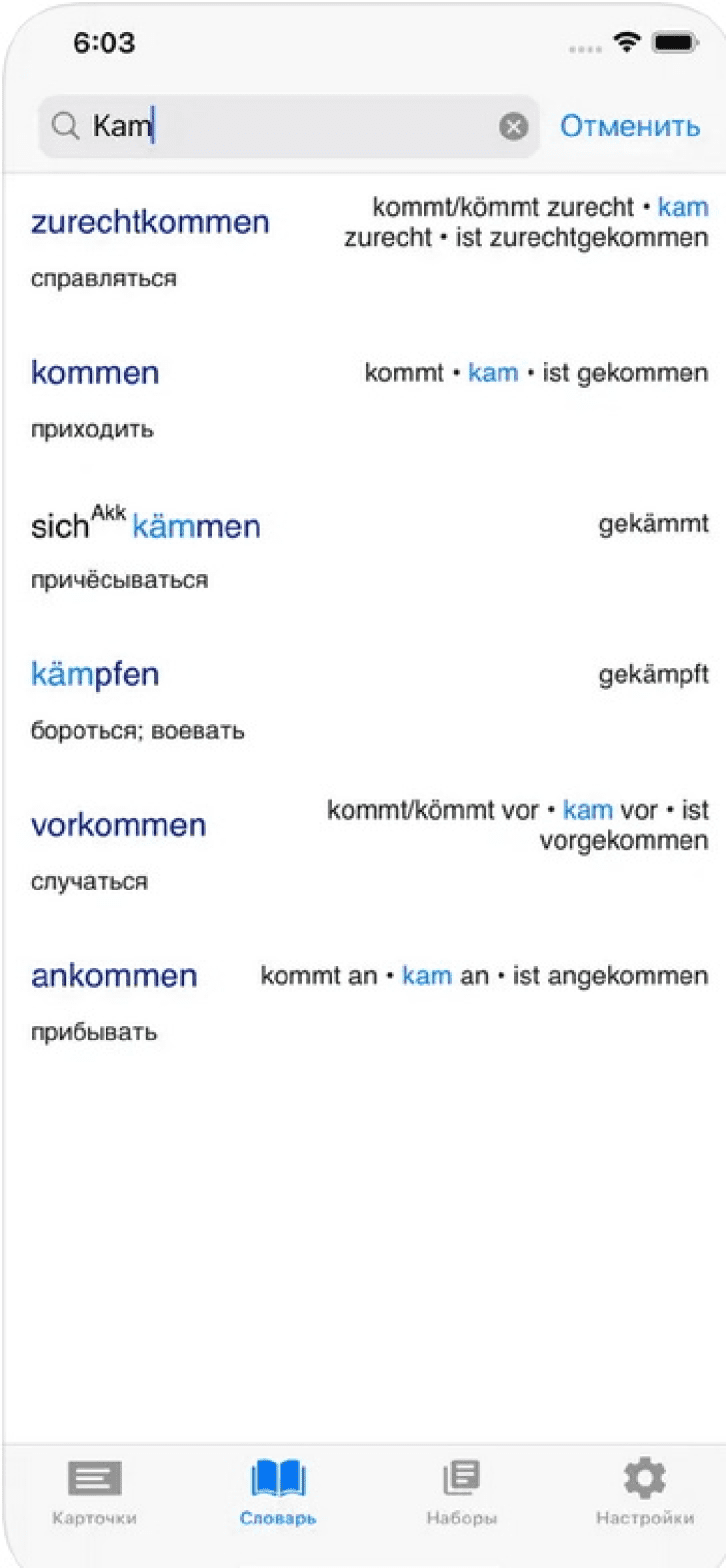 Ещё одной приятной особенностью программы является наличие встроенного словаря с удобным поиском. Он позволяет искать глаголы как по начальной форме, так и по Präsens, Perfekt (Partizip 2), Präteritum, либо по переводу.