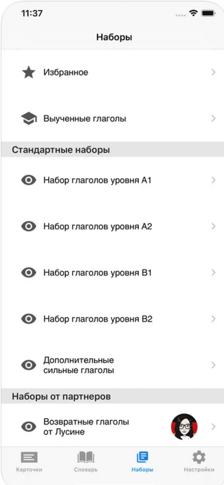 - наличие более, чем 600 карточек с самыми полезными глаголами немецкого языка;
