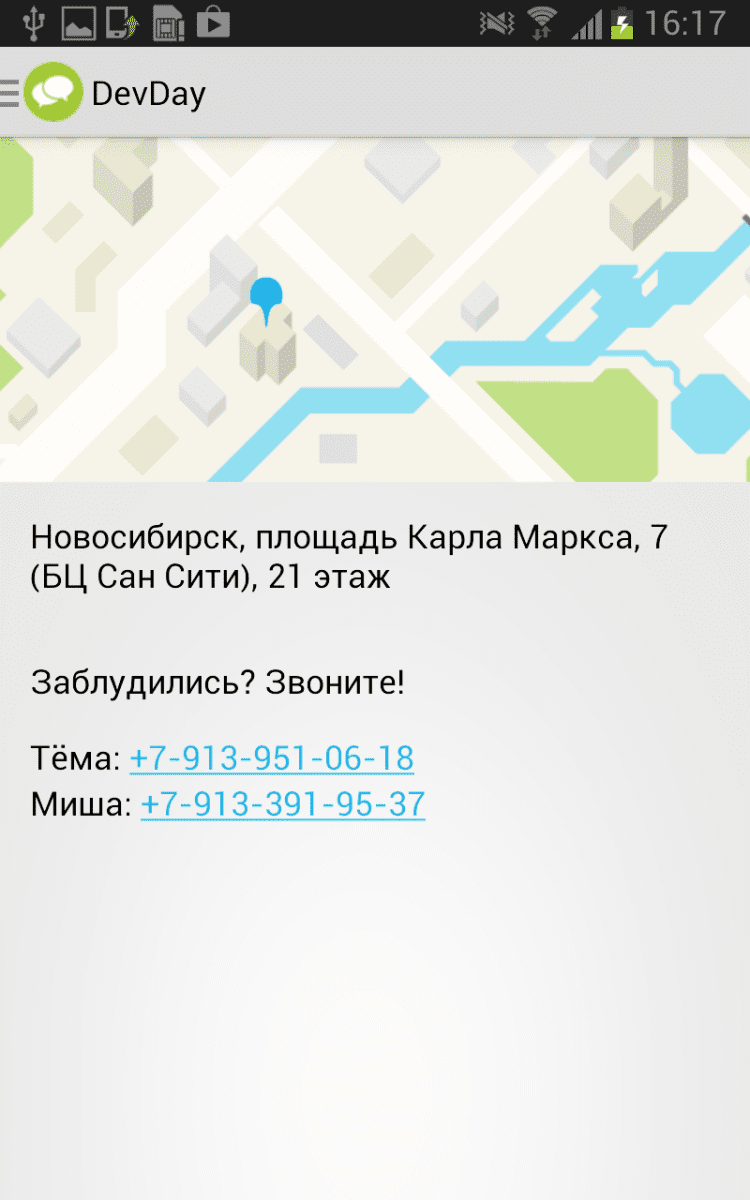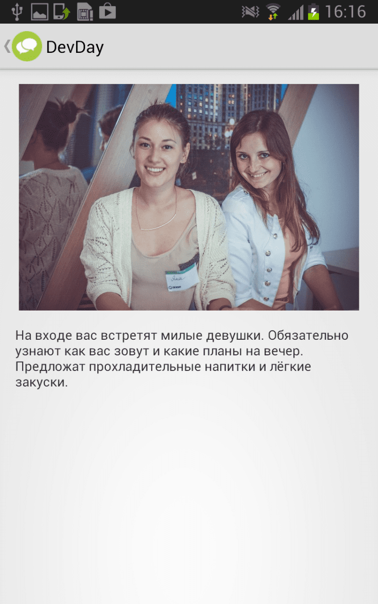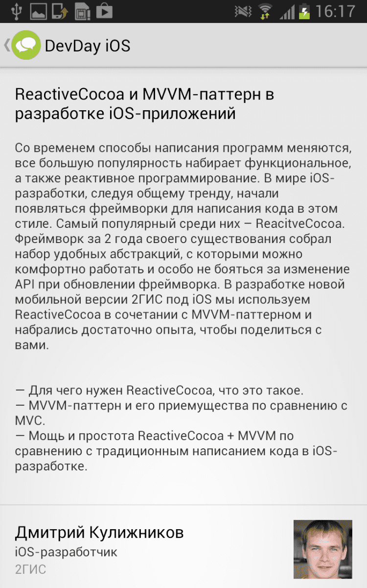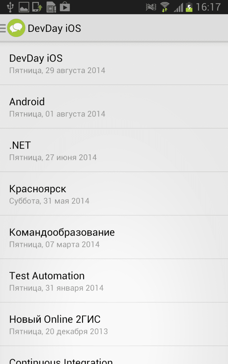DevDay Официальное приложение DevDay для Android, в которой вы всегда сможете не только ознакомиться с архивом прошлых мероприятий, но и с программой предстоящих встреч. DevDay - это открытые встречи специалистов в сфере IT, организованные компанией 2ГИС. На таких мероприятиях обсуждаются актуальные вопросы разработки, тестирования, менеджмента и дизайна.