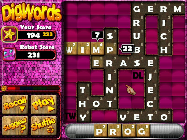 DigWords - это затягивающая игра, напоминающая кроссворд. Игра продолжается 12 раундов, в начале каждого раунда вам дается слово из 7 букв, и вам нужно подставлять к нему новые слова. Само игровое поле имеет размер 9х9, так что очень непросто правильно использовать отпущенное пространство. Игра создана для игры соло, но вы можете играть через интернет с другими пользователями.