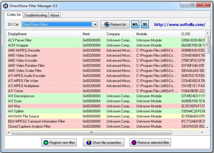 Помимо этого, программа обладает возможностью отфильтровывания кодеков Microsoft, либо сторонних компаний, удаления существующих кодеков, или регистрации новых. В случае необходимости, DirectShow Filter Manager позволяет произвести сброс к стандартным кодекам DirectX.