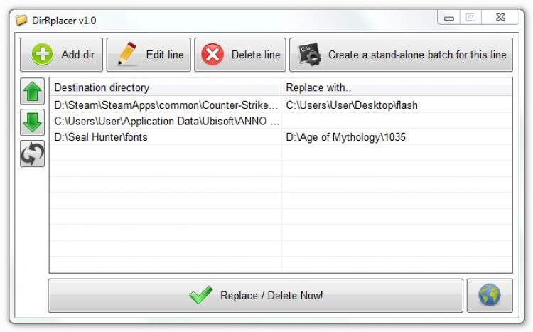 DirRplacer Компактная и простая утилита, предназначенная для периодической замены или удаления папок с фиксированными путями. Для этого просто добавьте нужные папки в программу, и нажмите кнопку Replace/Delete.
