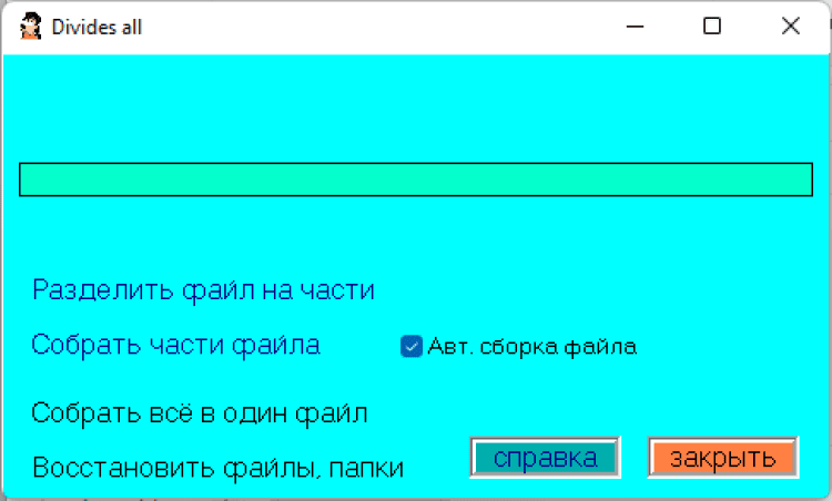 Divides all Программа быстро поделит большой файл от 100 Б. до 4 Гб. на 2 разные по величине части или 3, 4, 5, 6, 7 равные части, а так же соберёт эти файлы в один файл. Поделённые части файла (видео файла) можно записать на несколько дисков, с последующей сборкой в один файл. А также быстро соберёт папки файлы в один файл (Без сжатия).