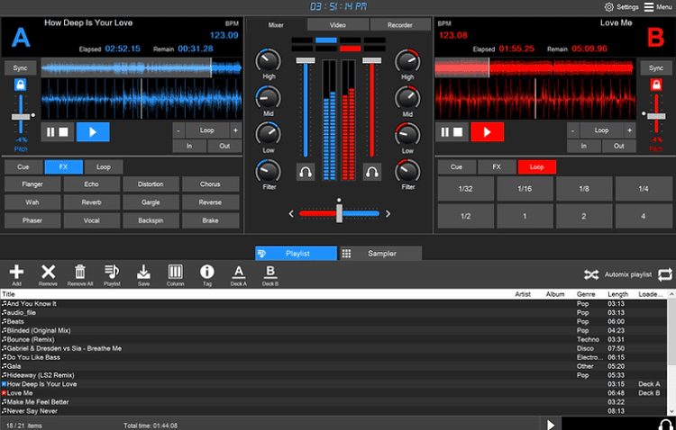 DJ Music Mixer предоставляет все необходимое для микширования треков. Он позволяет зацикливать треки, изменять питч, применять реалтаймовые эффекты и многое другое. В программе есть настраиваемый эквалайзер с готовыми пресетами настроек.