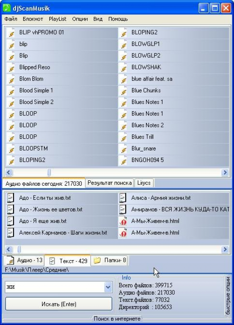 d.j.ScanMusik - это поисковая система аудио файлов, на локальном компьютере и сети интернет. Программа разрабатывается в тесном контакте с диджеями и музыкантами работающими с компьютерами. Оcновные отличия от программ подобного класса: Удобный вывод результатов поиска по категориям (Аудио, Текст, Папки). Моментальный поиск в режиме реального времени - поиск начинается в момент ввода данных в поисковую строку. Гибкий алгоритм поиска позволяющий находить нужное даже при граматических ошибках со стороны пользователя ("нечёткий фильтр")- актуально для тех кто не знает или просто не помнит правильное название.
