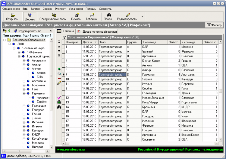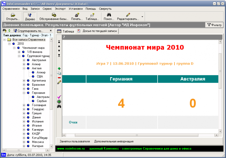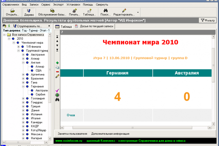 Дневник болельщика. Результаты футбольных матчей - это система, в которой предусмотрено введение самой главной информации: название матча, номер и дата игры, играющие команды, забитые мячи и их авторы, заработанные очки. Если этих полей не достаточно, то можно ввести более подробное описание прошедшей игры. Результаты соревнований можно экспортировать в следующие форматы: TXT, RTF, XLS, HTML.