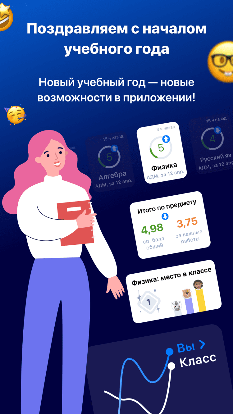 - PUSH-уведолмения о новостях, объявлениях и новых оценках;