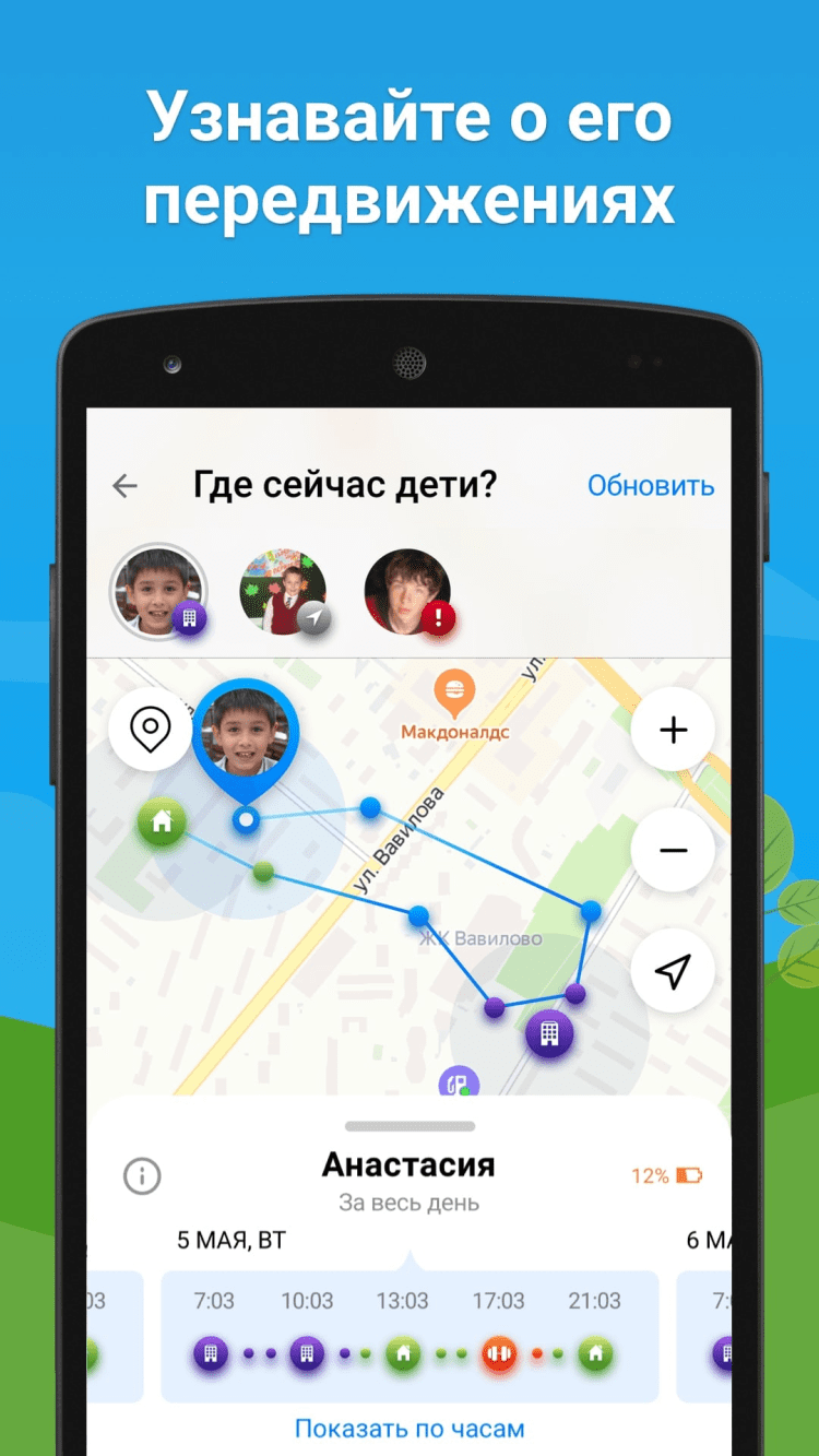 - определение местоположения ребенка на карте;