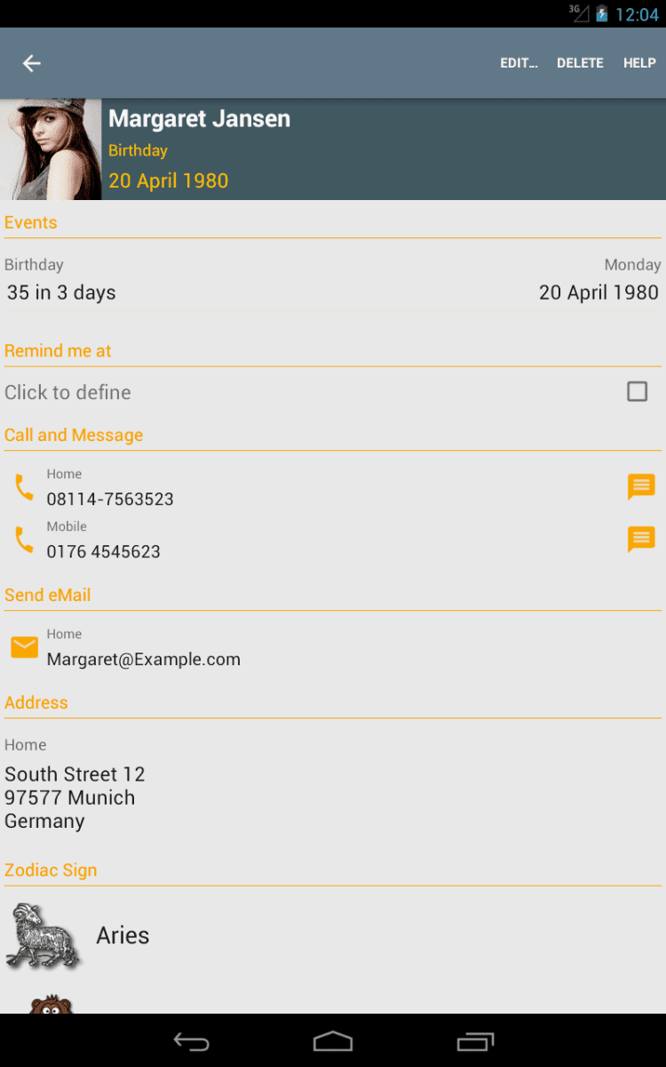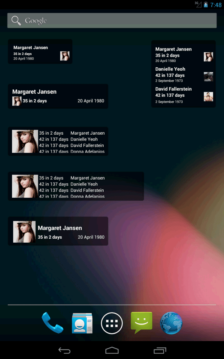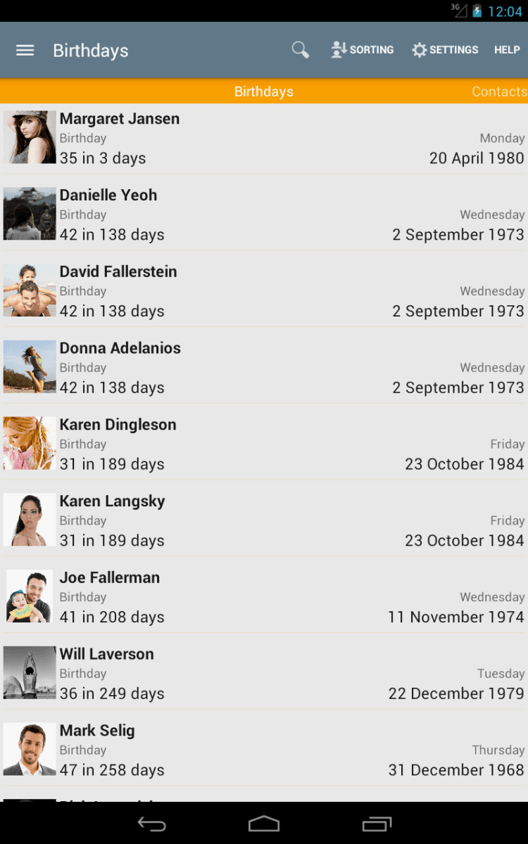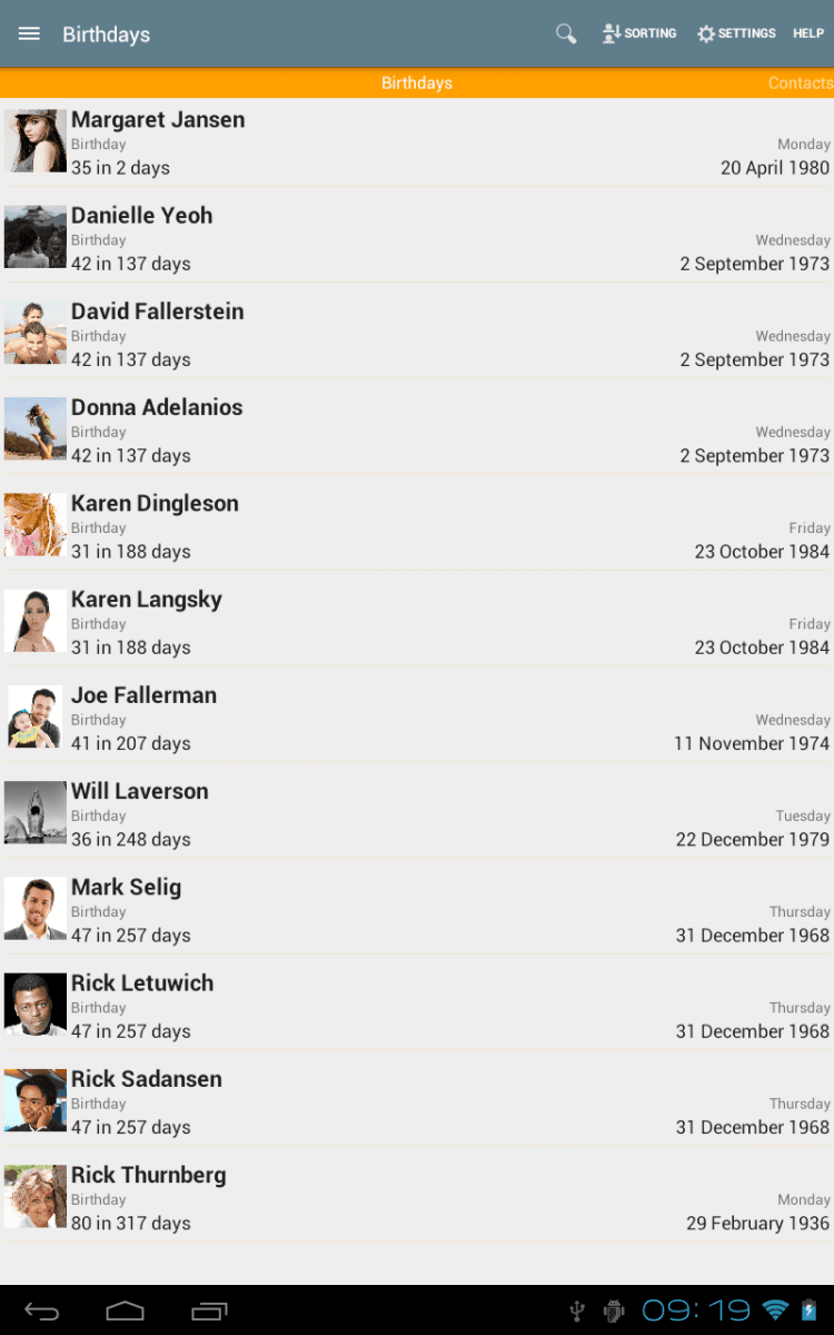Дни рождения Простой просмотрщик дней рождения с виджетами и напоминаниями. Содержит список всех контактов с днями рождения, так что вам больше не нужно их искать. Простой импорт друзей из Facebook! Виджеты всегда напомнят чей день рождения приближается. Иконка в строке состояния поможет не забыть про день рождения. Телефонные функции позволят позвонить или отправить сообщение или почту.
