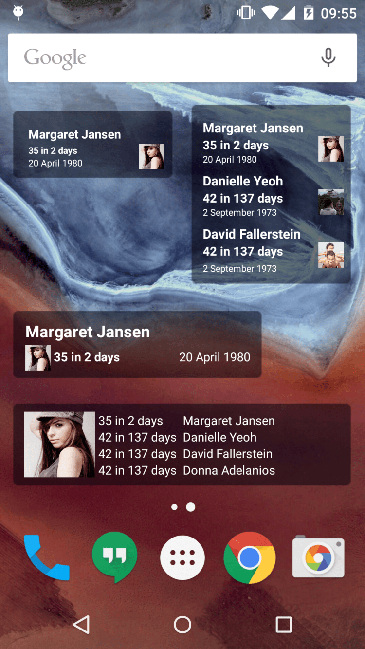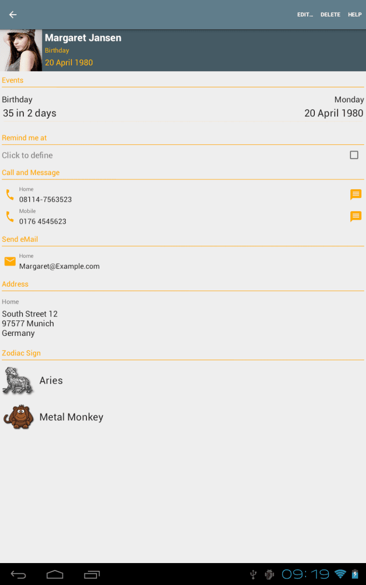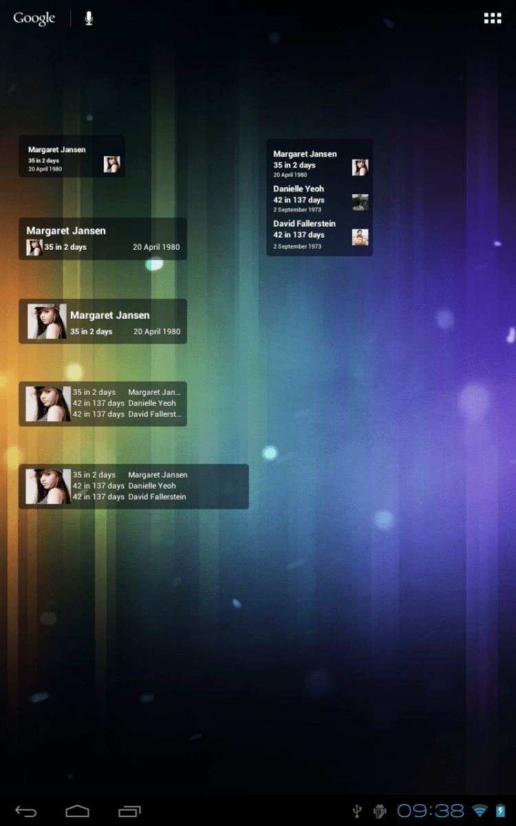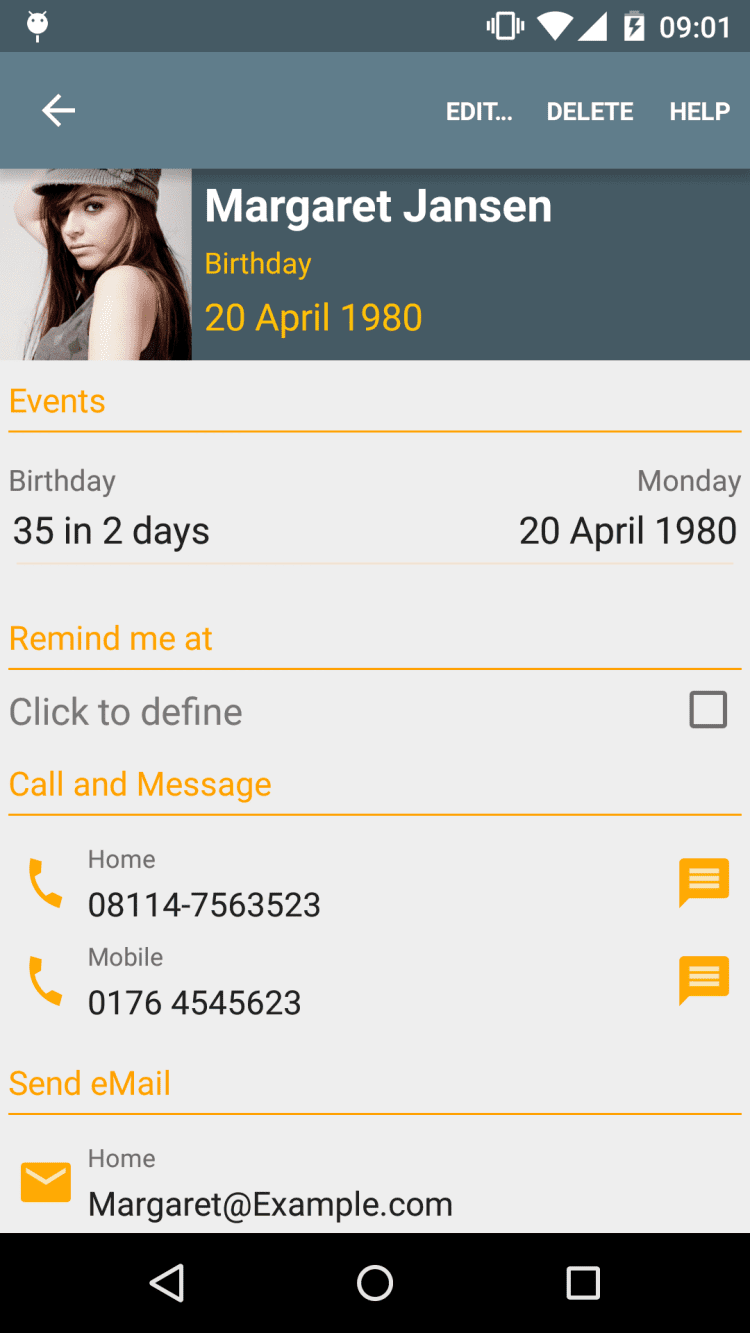 Дни рождения Простой просмотрщик дней рождения с виджетами и напоминаниями. Содержит список всех контактов с днями рождения, так что вам больше не нужно их искать. Простой импорт друзей из Facebook! Виджеты всегда напомнят чей день рождения приближается. Иконка в строке состояния поможет не забыть про день рождения. Телефонные функции позволят позвонить или отправить сообщение или почту.