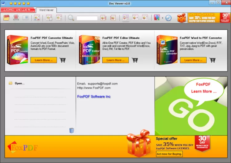 Программа для просмотра документов, созданных в программе Microsoft Office Word (DOC, DOCX). Помимо этого, поддерживает файлы в формате RTF и простые текстовые файлы. Не требует оригинального ПО от Microsoft. Позволяет просматривать, масштабировать, поворачивать и зеркально отражать документы, а так же отправлять их по электронной почте.