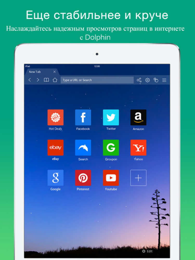 Благодаря функции "Быстрый Набор", Dolphin браузер для iPad поможет вам открыть любимые сайты одним касанием. Поместите ссылки на любимые сайты на главный экран программы, чтобы в дальнейшем заходить на них, всего лишь нажав на соответствующую кнопку.