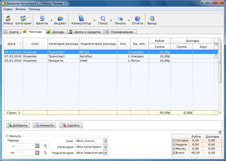 "Домашняя бухгалтерия" - это программа для ведения учета домашних финансов и является комплексным решением для учета финансов, как на персональном, так и на карманном компьютере, со встроенной системой синхронизации данных между компьютерами. С ее помощью Вы можете вести учет не только личных финансов, но и финансов всей своей семьи или использовать ее для ведения бухгалтерии вашей компании. Программа проста в использовании и не требует от пользователя знаний бухгалтерского учета.
