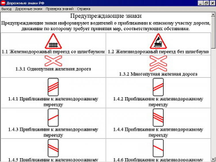 Дорожные знаки РФ - это бесплатная программа состоит из двух частей, первая - для изучения дорожных знаков, вторая - для проверки ваших знаний. Проверка в свою очередь проводится по изображению знака и по его названию.