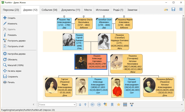Древо Жизни - это программа для построения родословных деревьев, хранения и отображения информации о людях и о событиях в их жизни. Программа проста в использовании, но в то же время имеет широкие возможности: автоматически строит родословные деревья с фотографиями, содержит механизм событий, позволяющий создавать сложные жизнеописания, позволяет хранить текст, фото, звук и видео, имеет возможность поиска, сортировки и фильтрации данных, получения статистики.