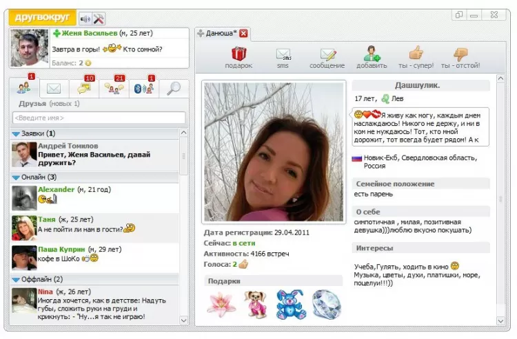 Приложение работает на компьютерах под управлением Windows 11, 10, 8.1, 8, 7, Vista, XP. Друг Вокруг можно скачать бесплатно на нашем сайте без регистрации и СМС. В программе существуют и платные сервисы, к которым относятся смайлики, стикеры, подарки.