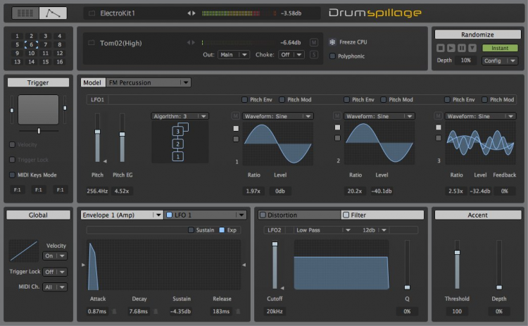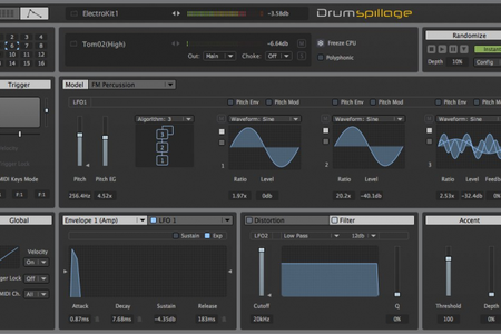 DrumSpillage Драм-синтезатор, использующий элементы физического и аналогового моделирования звука. Данный плагин совместим с большинством приложений для звукозаписи под Mac.