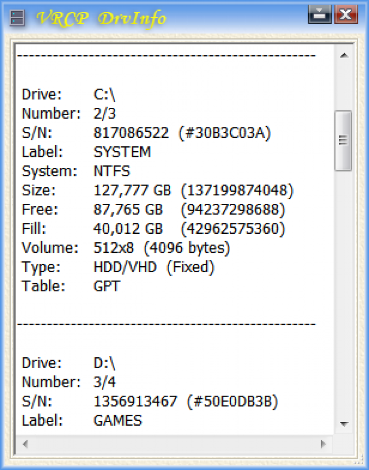 DrvInfo - это утилита отображает основную краткую информацию о всех подключённых к компьютеру носителях информации (FDD, HDD, FlashDrive, CD/DVD/Blu-Ray, сетевых, виртуальных, RAM-дисках и др.). Данные полей 'S/N' (в DEC-формате) и 'Label' можно использовать для фильтрации обрабатываемых дисков.