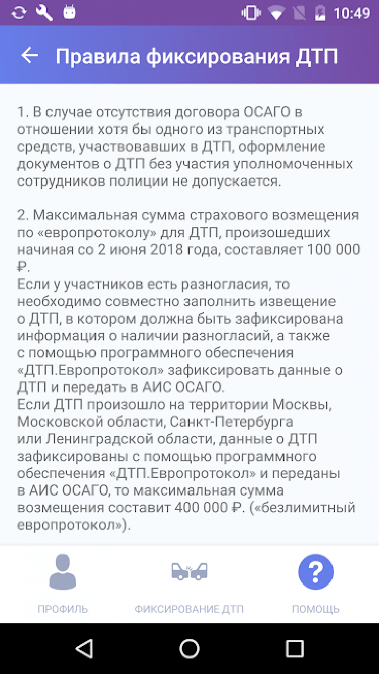 Приложение предназначено для обращения потерпевшего в страховую компанию в случае оформления ДТП без участия уполномоченных сотрудников полиции в случаях, когда у участников ДТП есть разногласия (макс. выплата составляет 100 тыс.руб.), либо когда разногласий нет и участники оформляют "безлимитный Европротокол". Вы также можете добавить фотографии повреждённых транспортных средств и время, а также координаты ДТП. Для этого, необходимо не только скачать на устройство последнюю версию программы, но и авторизоваться в ней при помощи подтверждённой учётной записи на "Госуслугах". В противном случае, возможности программы будут ограничены проверкой полисов ОСАГО по серии и номеру, либо путём сканирования QR-кода.