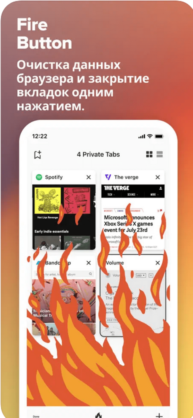 Кроме того, браузер обладает стандартными функциями просмотра, среди которых открытие новых вкладок, создание закладок и заполнение форм. А для повышения конфиденциальности в сети, вам будут доступны некоторые новые возможности. К примеру, нажав на кнопку "Пожар", вы мгновенно закроете все вкладки и очистите данные. А для защиты доступа к приложению, вы можете использовать функции идентификации по отпечатку пальца (Touch ID) или лицу (Face ID).