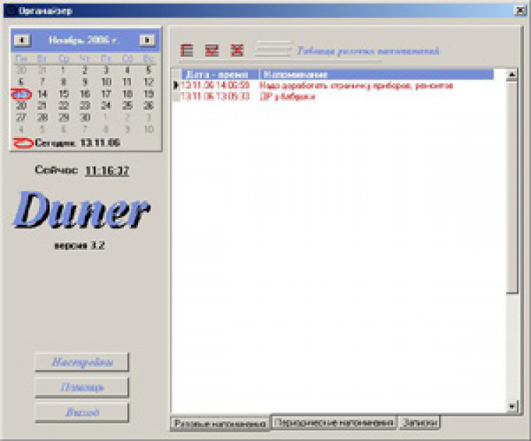 Duner - это небольшой и удобный органайзер вовремя напомнит вам о важной встрече или звонке, или деле, которое вы отложили до лучших времен. В новой версии Duner появились периодические напоминания, а также остались старые добрые разовые напоминания и записки.
