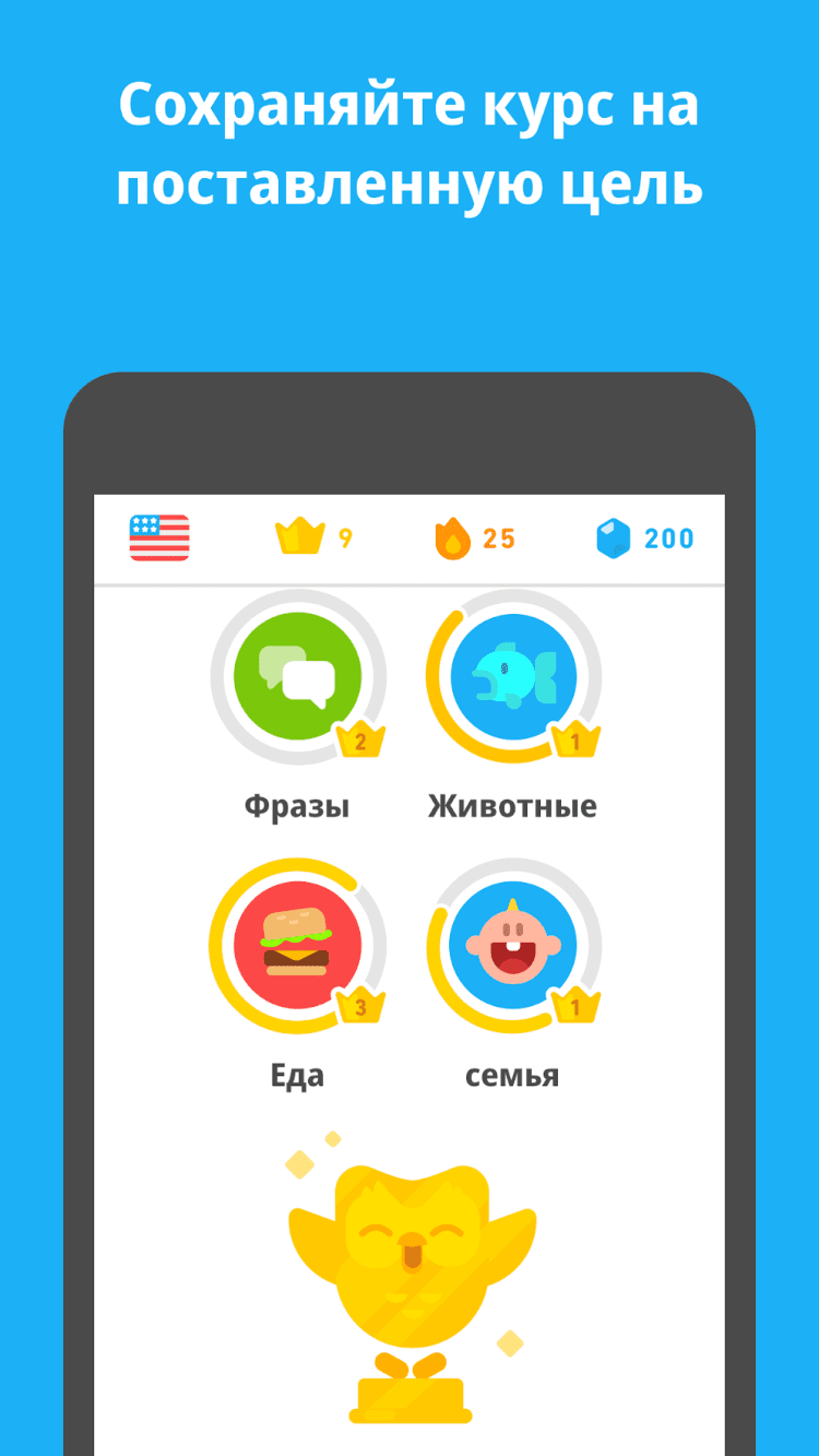 - Веселый помощник Duo. Одноименный помощник Duo рассказывает о вашем прогрессе и сообщает детали новых упражнений. Это не учитель, а верный товарищ в преодолении языковых трудностей. Разработчики наделили сову Duo чувством юмора, поэтому она нередко весело хвалит пользователя за достижения и подбадривает его при неудачах.