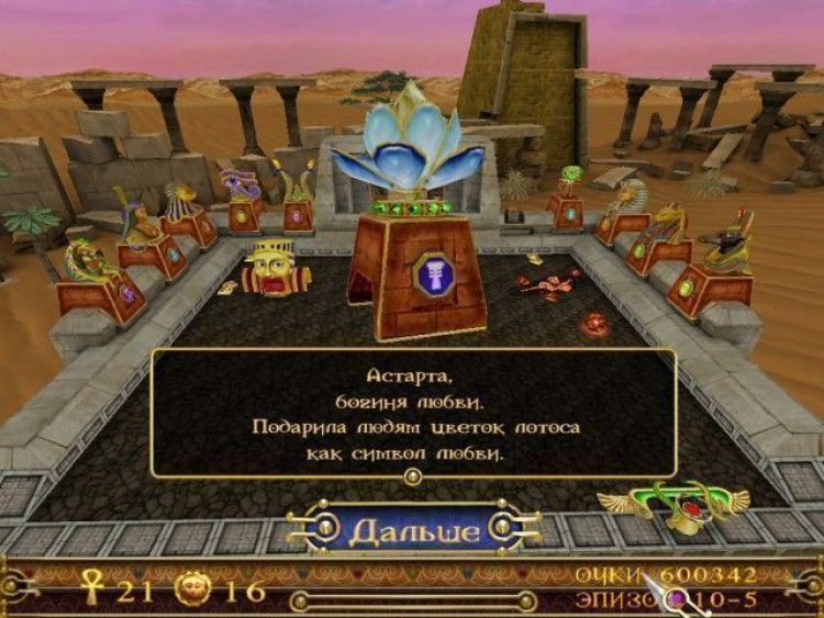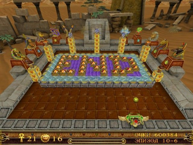 С помощью этих нехитрых инструментов вам нужно очистить множество красочных уровней от блоков различной конфигурации. Эта миссия требует предельного внимания если вы упустите мячик, то потеряете одну жизнь. Впереди немало сюрпризов, и не всегда приятных. В особенности оберегайте ракетку от столкновения с тяжелыми предметами, которые могут разрушить ее. В конце каждого этапа вы получите один из 10 артефактов. Собирайте их, чтобы найти путь к храму бога Амун-Ра. Только в его силах вдохнуть жизнь в опустевшие города и долины. Выполнить эту миссию вам помогут бонусы и дополнительные мячики, обладающие необычными свойствами.