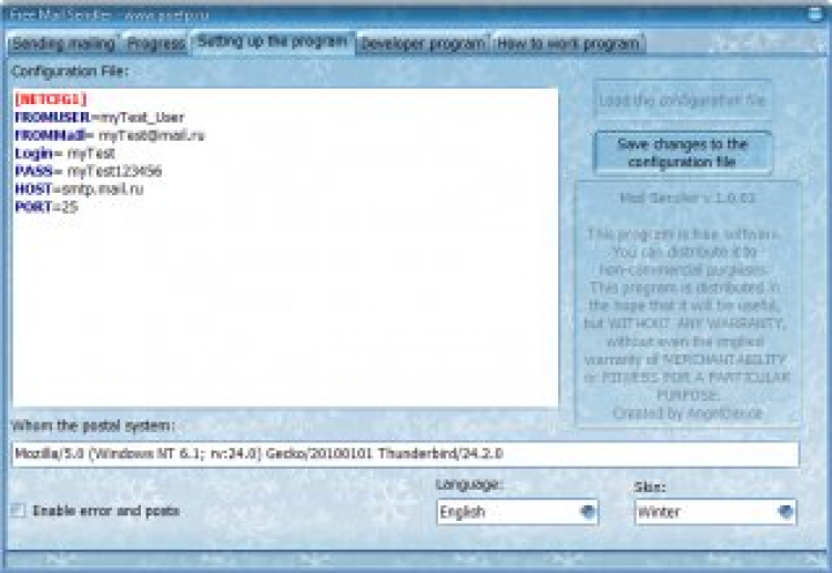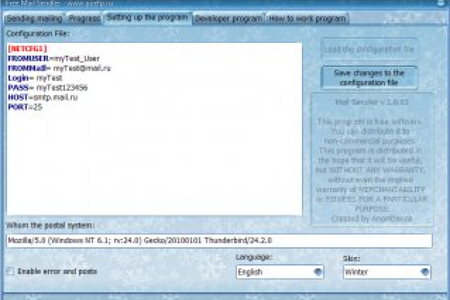 E-Mail Sendler - это программа позволяет настроить автоматическое отправление писем любому количеству клиентов. Позволяет отправлять разным группам клиентов разные сообщения (E-Mail). Поддерживает публичные smtp-сервера. Гарантировано не блокируется спам-фильтрами и спам-ботами. Полная и подробная инструкция есть в самой программе. Программа поддерживает два языка: Русский и Английский, но вы можете добавить в нее любые языки, какие сочтете нужными. Программа поддерживает скины (встроено около 5 скинов).