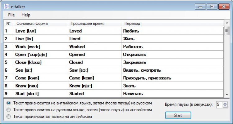 e-talker - это программа-тренажер (с открытым исходным кодом) поможет вам запомнить произношения английских глаголов по методу Дмитрия Петрова (урок 1 телепрограммы "Полиглот", показанной на канале "Культура"). Глаголы в сочетании с субъектными местоимениями произносятся в случайном порядке в настоящем, прошедшем и будущем временах в вопросительных, утвердительных и отрицательных формах. Необходимо самостоятельно вспомнить перевод фразы, который после небольшой паузы произносится программой автоматически для самоконтроля. Для работы приложения требуется среда .NET Framework 2.0 или более поздняя.
