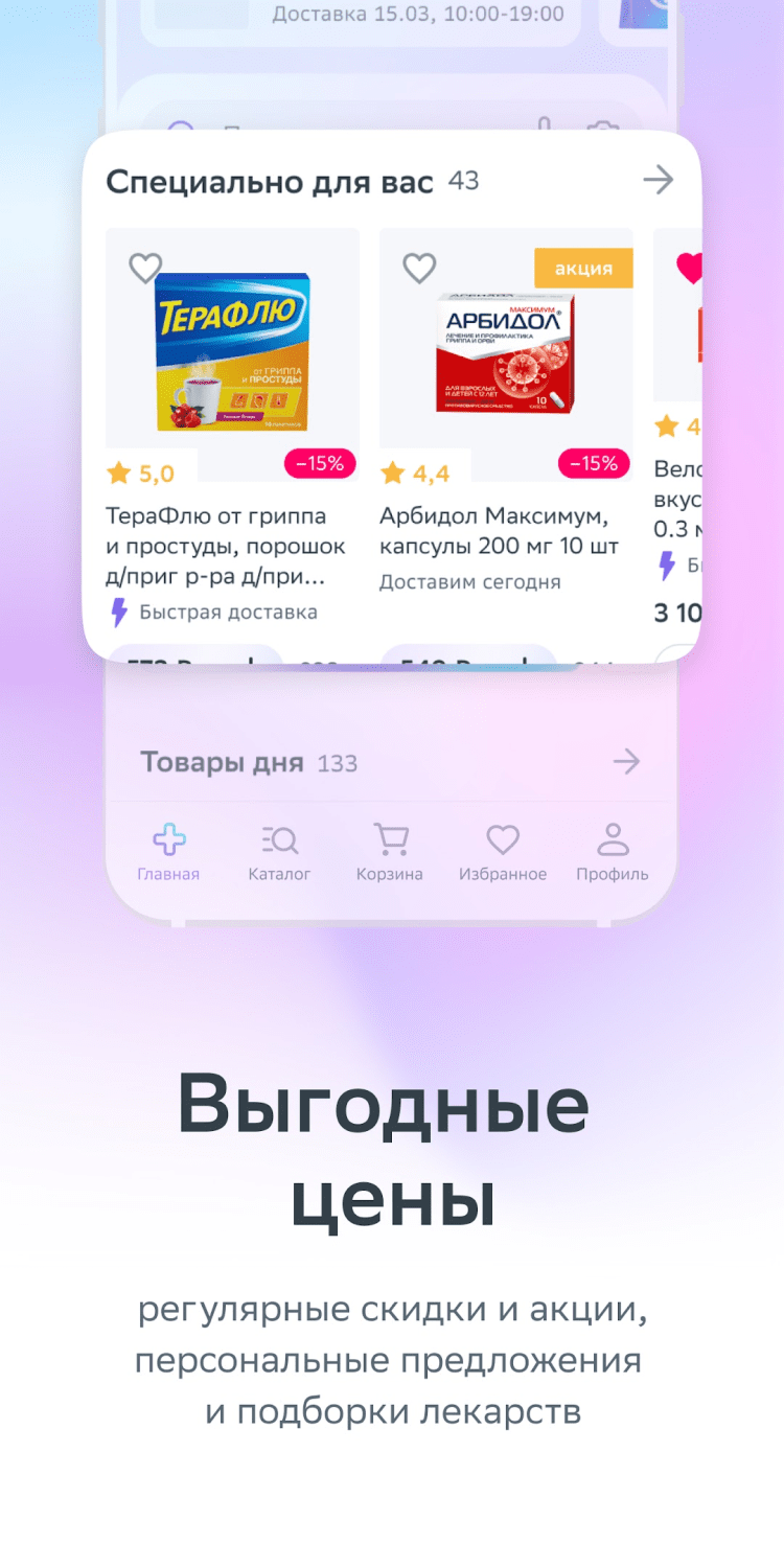 - поиск по названию товара, действующему веществу, штрих-коду или фотографии;