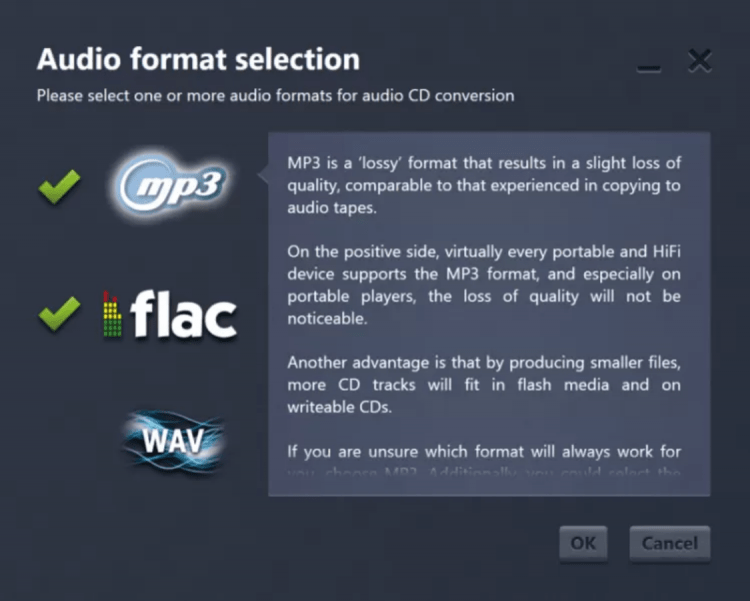 Easy Audio Copy позволяет выбрать, в какой формат конвертировать треки с диска. Она поддерживает только три формата (MP3, FLAC и WAV), но может конвертировать треки во все три за одну операцию.