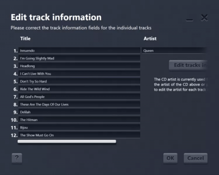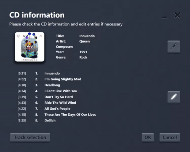 Вы можете выбрать, какие треки копировать с диска, а также редактировать название, исполнителя, композитора, год выпуска, жанр и прочую информацию.