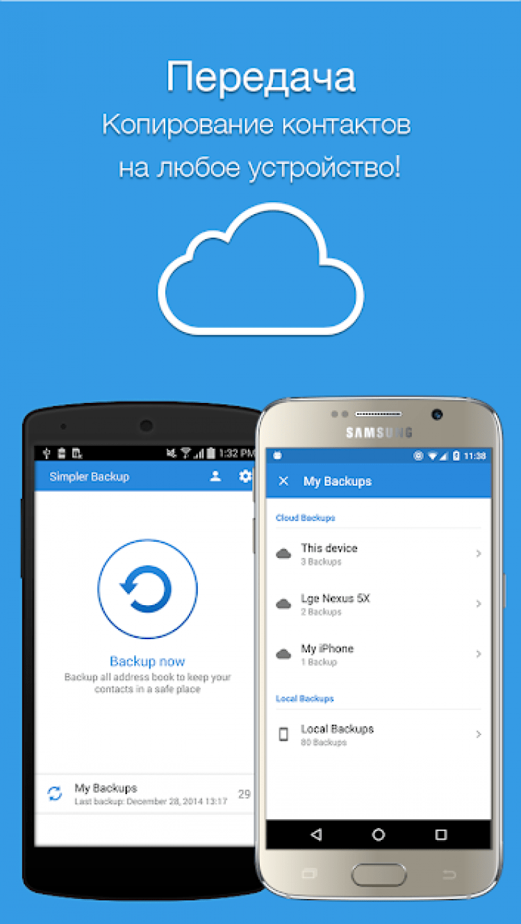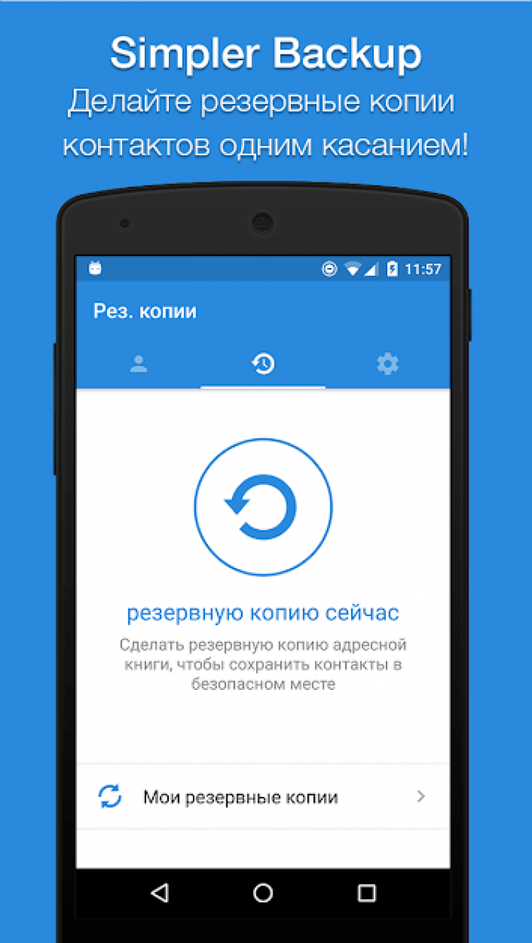 - Резервное копирование контактов в один тап.