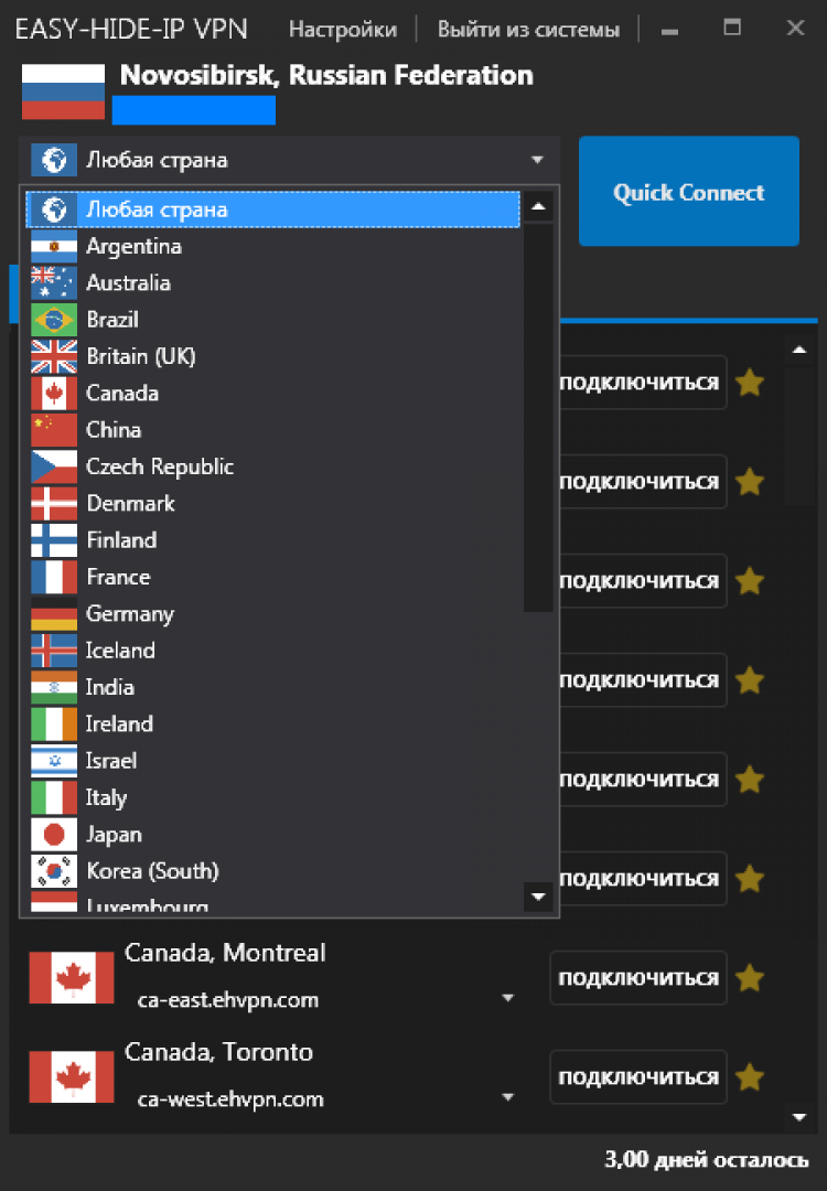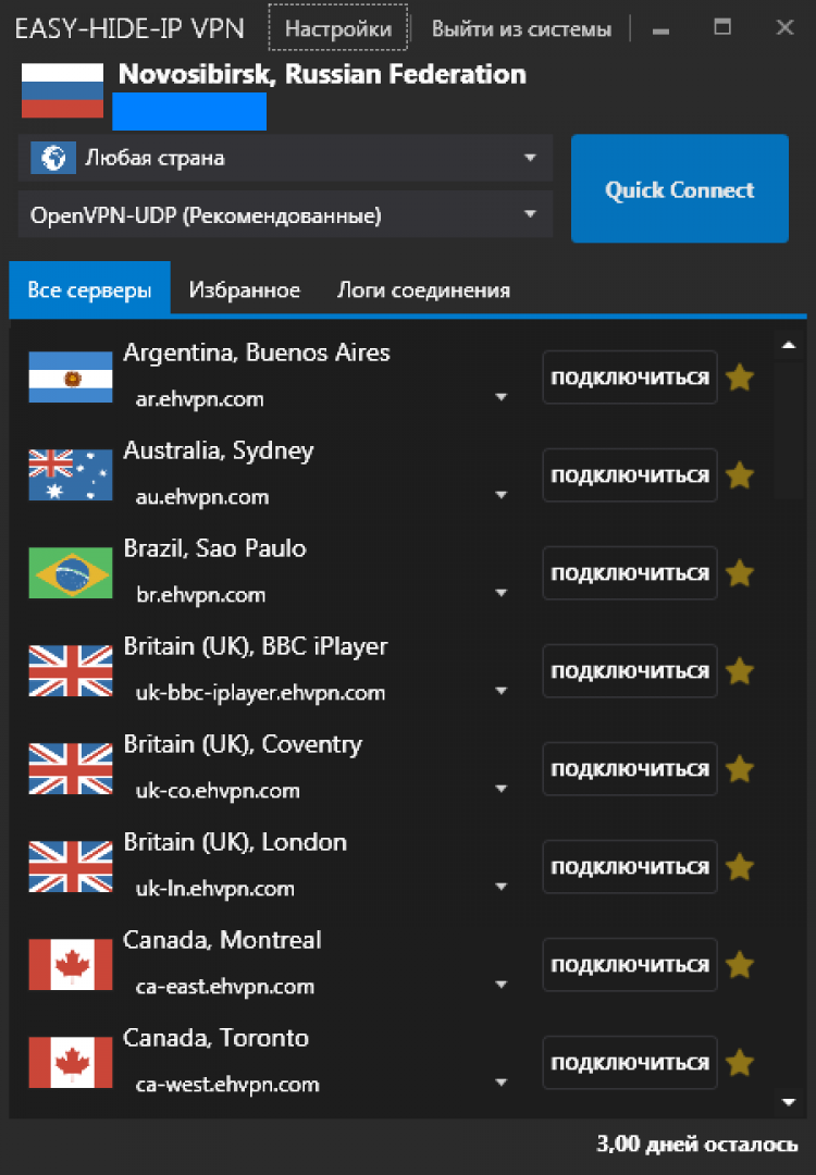 Программа позволяет выбирать и подключаться к любому серверу. Easy Hide IP также может менять IP-адресс в автоматическом режиме, каждые 30 минут.