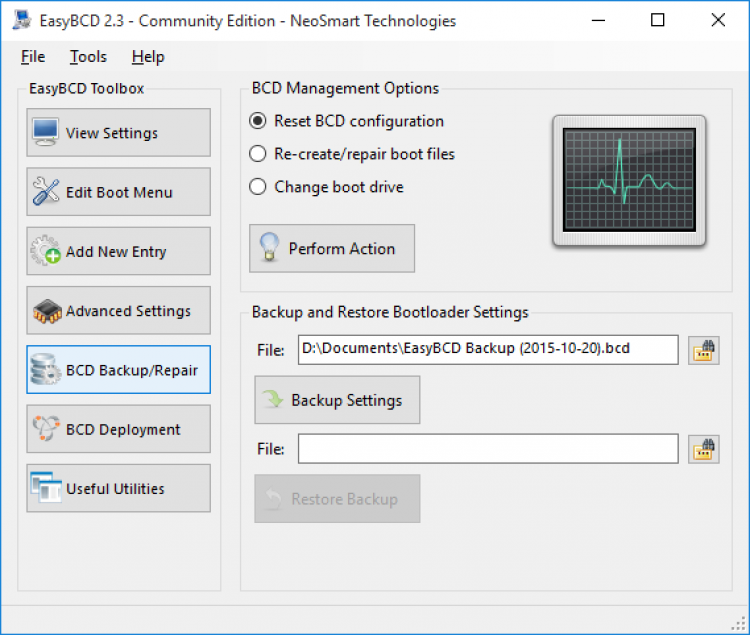 - содержит инструменты для восстановления и сброса BCD компьютера.