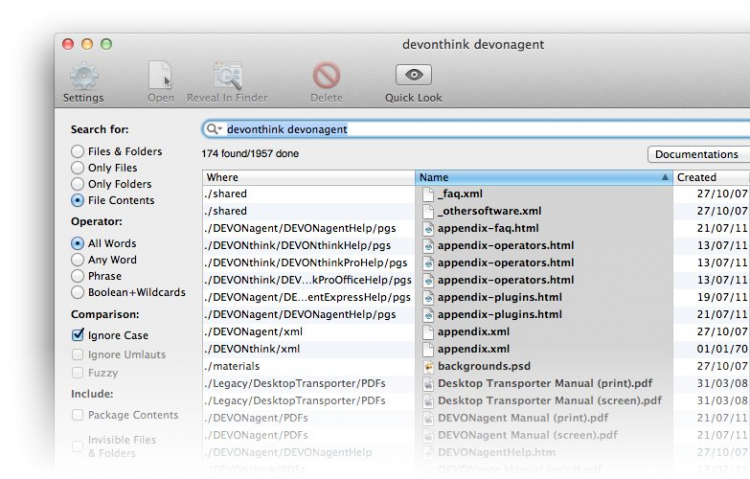 EasyFind Альтернатива Spotlight, которая умеет искать файлы и папки и проводить поиск по содержимому файла без индексирования.