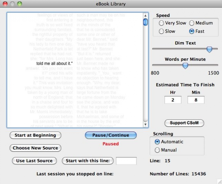 eBook Library Это приложение, может помочь пользователям развить навык быстрого чтения на скорости от 50 до 1500 знаков в минуту, используя простые текстовые файлы. eBook Library прокручивает текст, с выбранной пользователем скоростью, но если возникла необходимость прерваться - не беда, можно поставить на паузу и продолжить в другое время. При этом есть возможность использовать ручную прокрутку. Начать чтение книги можно с самого начала, или любой выбранной строки.